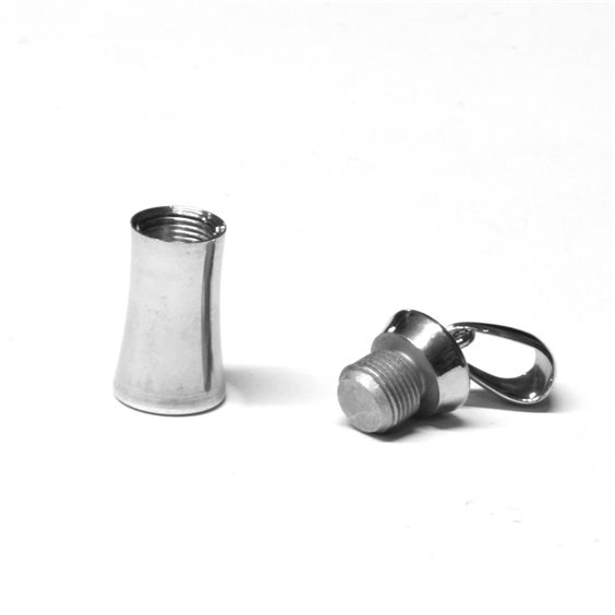 Un monile unico nel suo genere, ideato per custodire le nostre memorie, preservandole inalterate nel tempo e regalando ad ogni persona un ricordo sempre vivo e vicino. E' un prodotto a marchio "Made in Italy", realizzato interamente in argento 925%, nickel free e anallergico. Il ciondolo è composto da due parti: Un tappo rifinito con una filettatura a tenuta stagna, che lo rende adatto anche per conservare essenze e profumi. Un contenitore ricavato da un attento e preciso lavoro di tornitura di un cilindro massiccio in argento 925%, un materiale nobile ed estremamente versatile.
