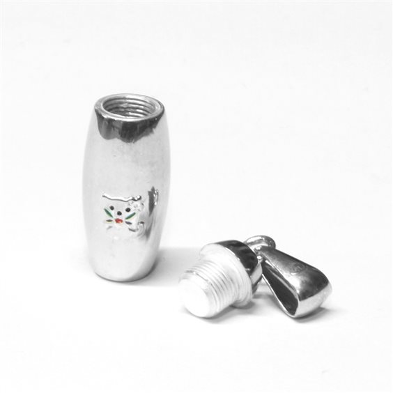 Un monile unico nel suo genere, ideato per custodire le nostre memorie, preservandole inalterate nel tempo e regalando ad ogni persona un ricordo sempre vivo e vicino. E' un prodotto a marchio "Made in Italy", realizzato interamente in argento 925%, nickel free e anallergico. Il ciondolo è composto da due parti: Un tappo rifinito con una filettatura a tenuta stagna, che lo rende adatto anche per conservare essenze e profumi. Un contenitore ricavato da un attento e preciso lavoro di tornitura di un cilindro massiccio in argento 925%, un materiale nobile ed estremamente versatile.